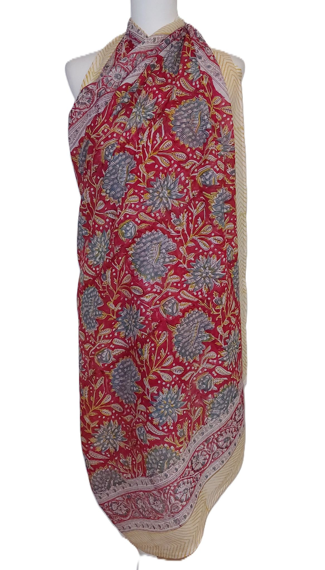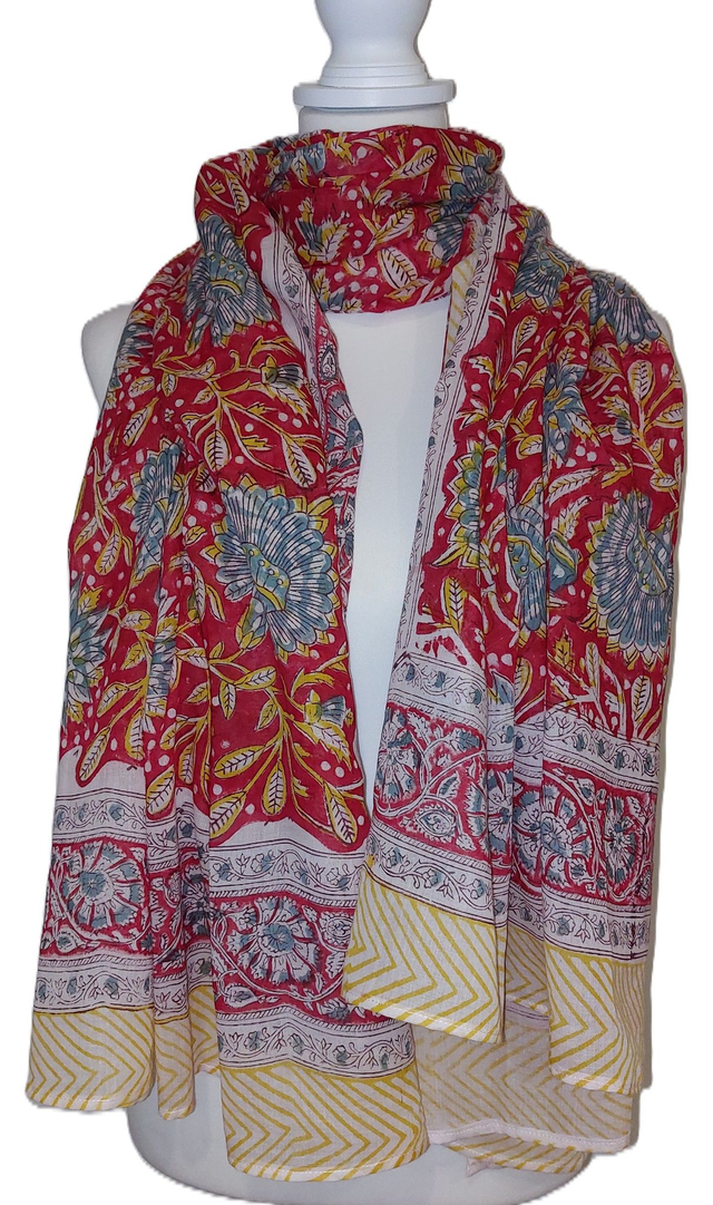 Paréo de plage en coton voile indien imprimé à la main – Motif floral rouge,bleu et jaune – Étole & châle bohème