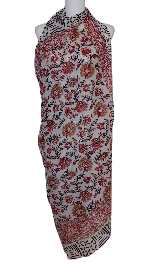 Découvrez ce paréo de plage en coton doux indien, imprimé à la main avec un motif floral rouge, brun et noir sur blanc. Idéal pour les amateurs de style bohème-chic et de matières naturelles, ce paréo est :
