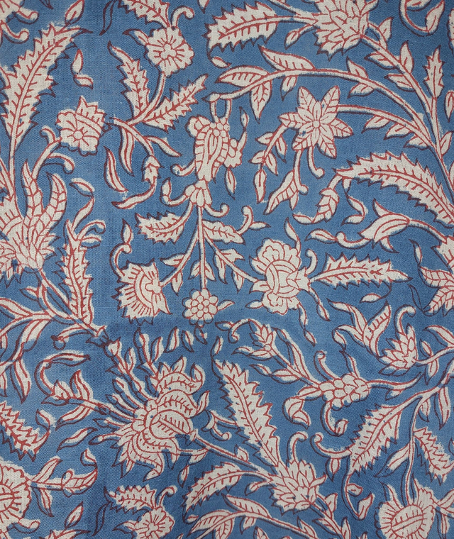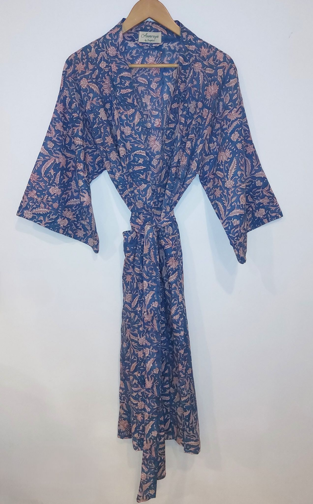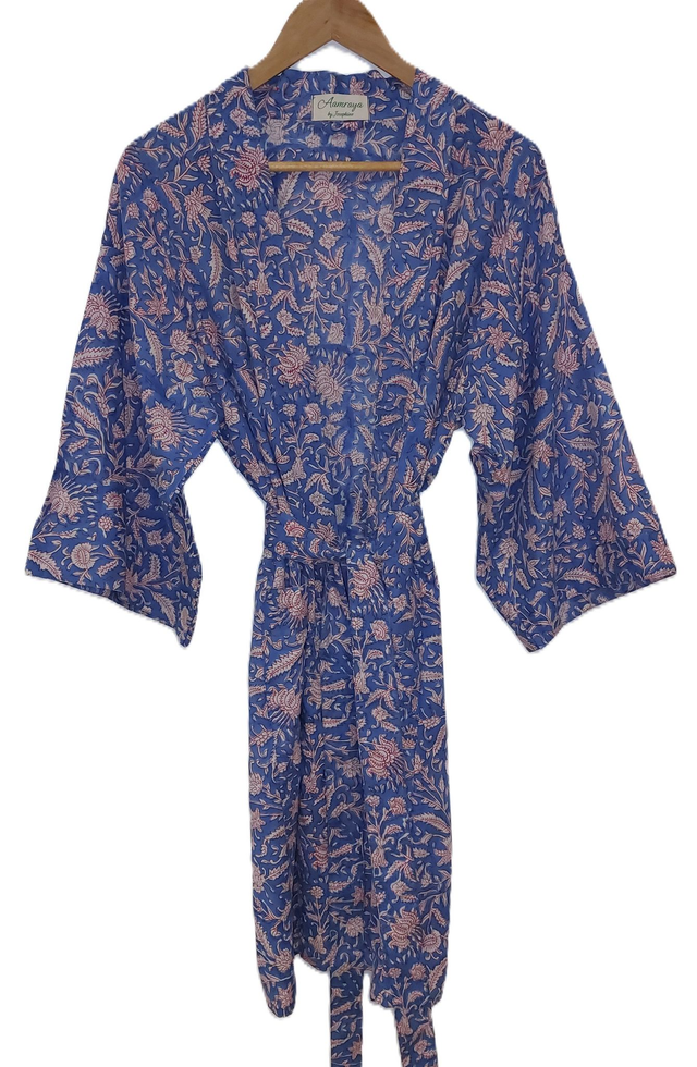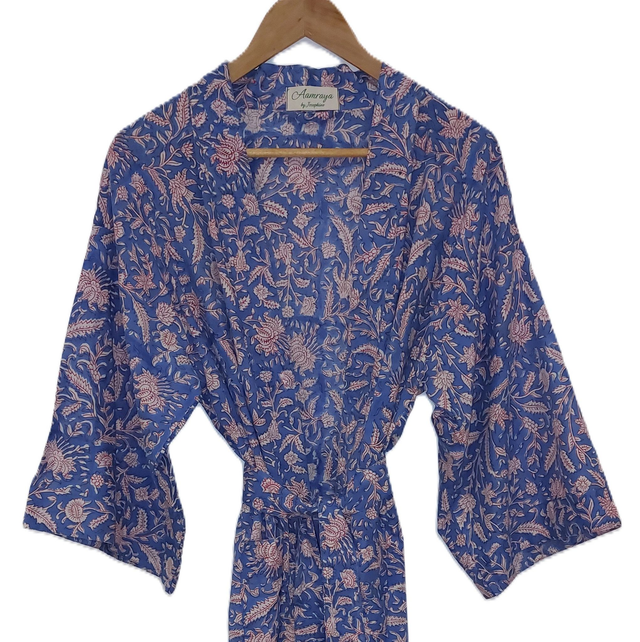 Robe kimono femme en coton naturel, doux et léger imprimé à la main façon block print, technique d'impression indienne au bloc de bois gravé à la main, avec un motif floral blanc et rouge sur un fond bleu clair. Parfait pour l'été à la maison, autour de la piscine, à la plage...