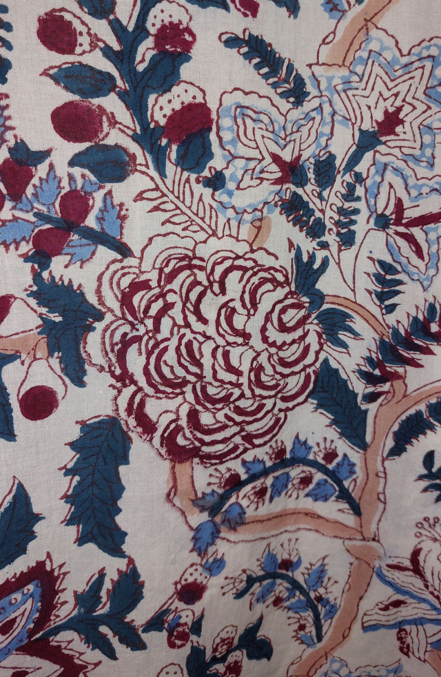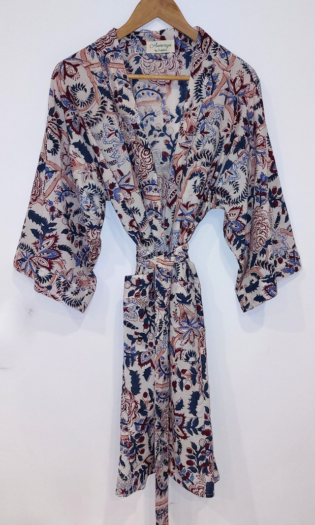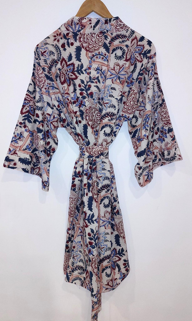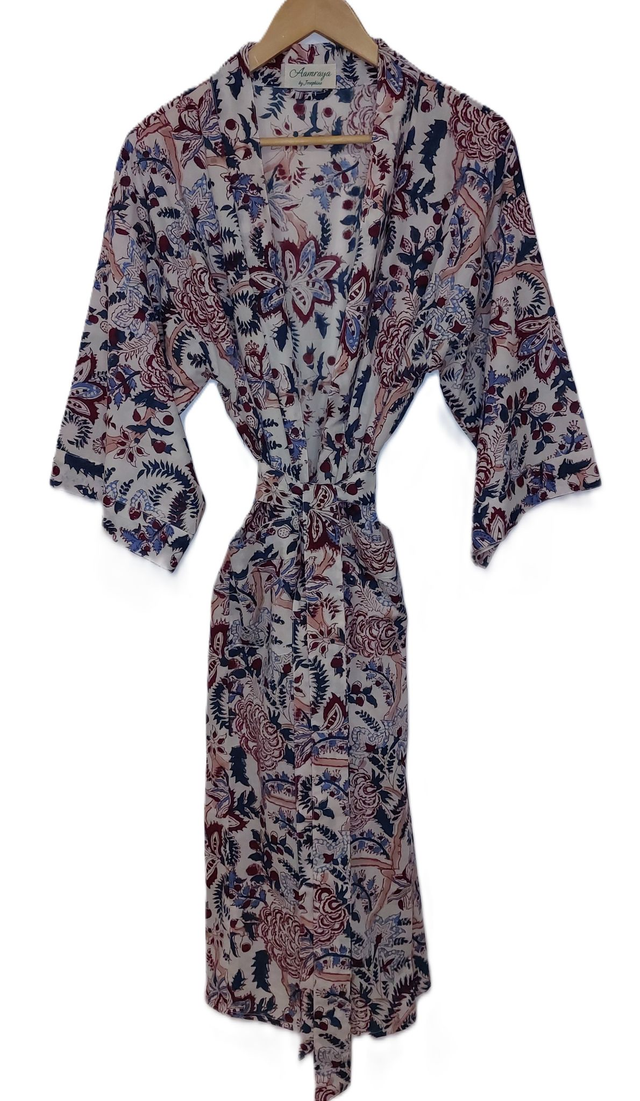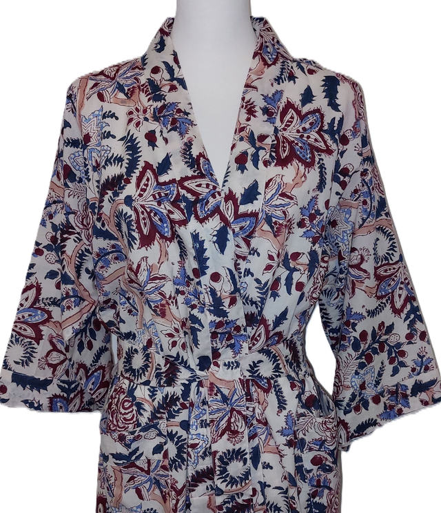 Robe kimono femme en coton naturel, doux et léger imprimé à la main façon block print, technique d'impression indienne au bloc de bois gravé à la main, avec un motif floral rouge, bleu, vert et rose sur un fond blanc. Parfait pour l'été à la maison, autour de la piscine, à la plage...