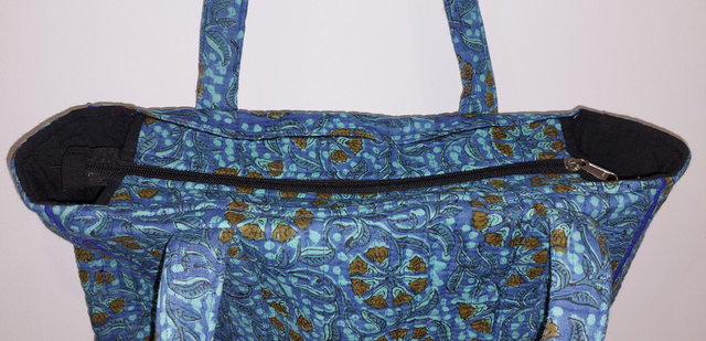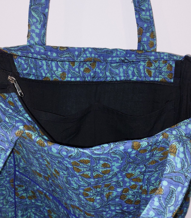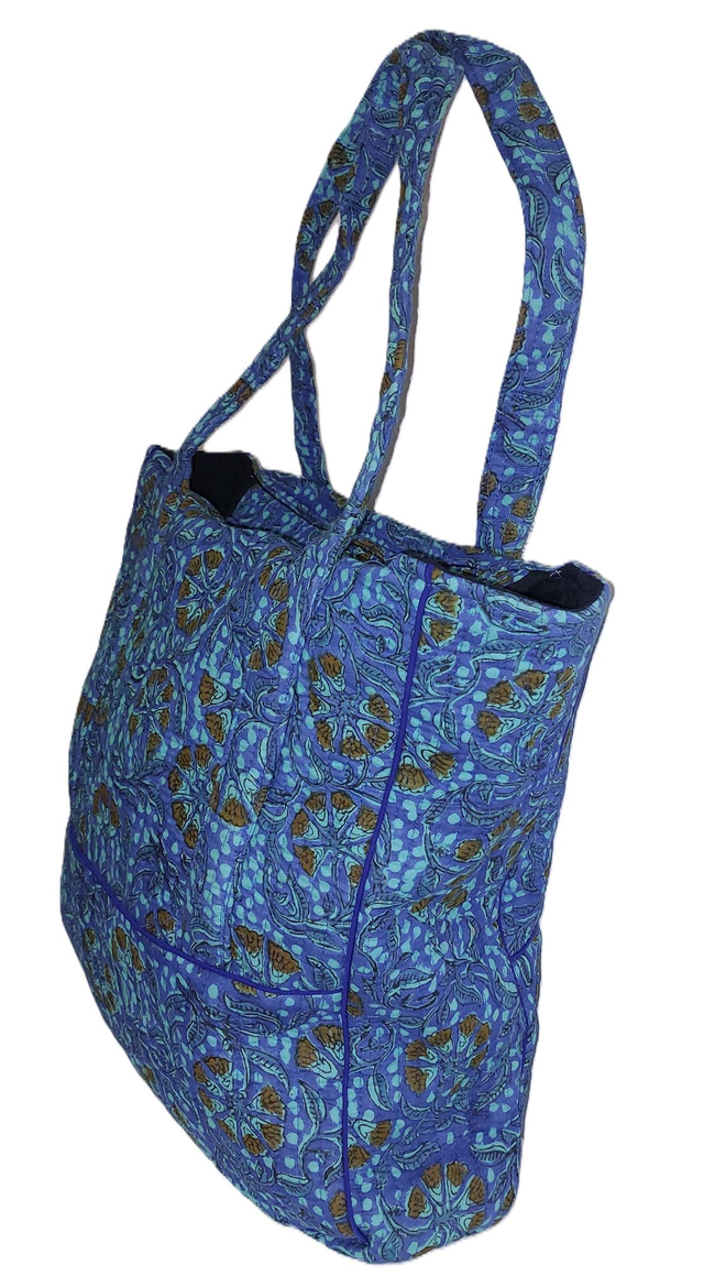 Découvrez ce sac cabas zippé en coton matelassé, à la fois stylé, fonctionnel et éthique. Chaque pièce est confectionné à la main avec soin, pour un accessoire unique et durable. Imprimé à la main au block print, motif floral bleu et marron.