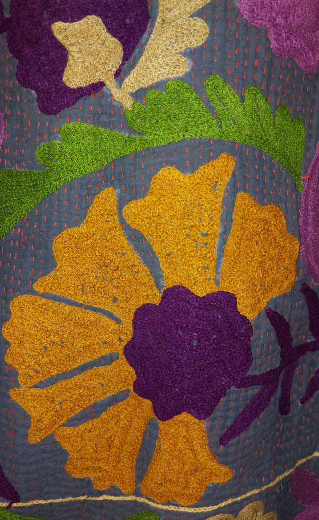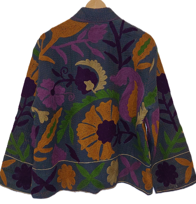 Veste kimono éthique, naturelle et écoresponsable confectionnée avec du kantha gris recyclé et orné de broderie Suzani en orange, violet, vert et beige. Chaque pièce est unique en raison du procédé artisanal, reflétant un savoir-faire authentique et une attention particulière aux détails.