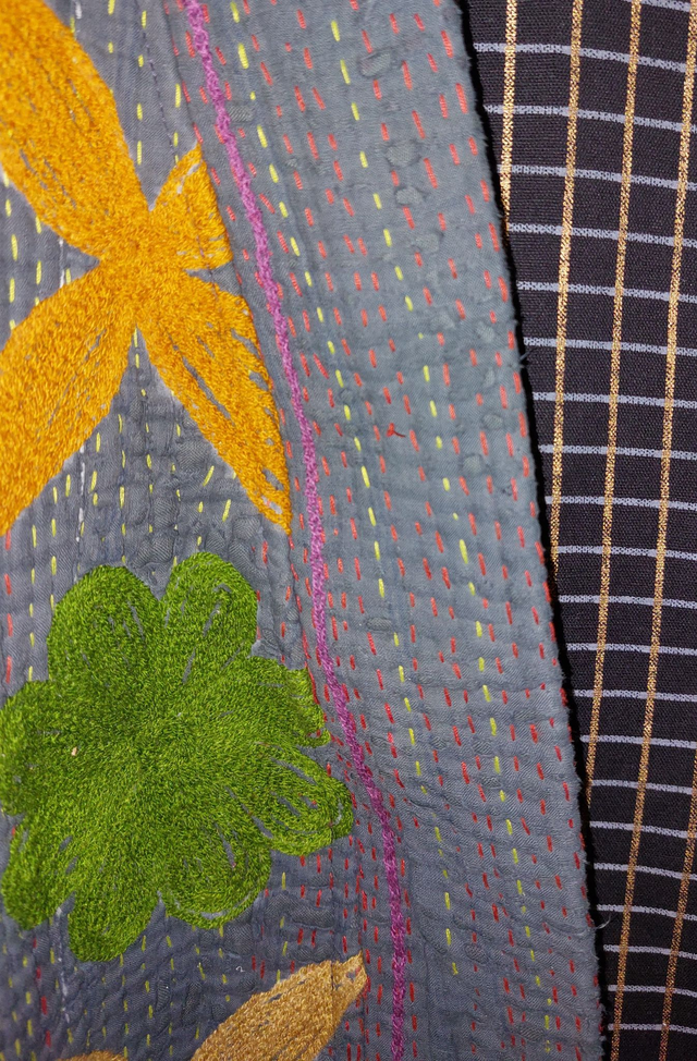 Veste en Kantha recyclé - Kimono gris - Brodé Suzani - Confectionné à la main - Pièce unique