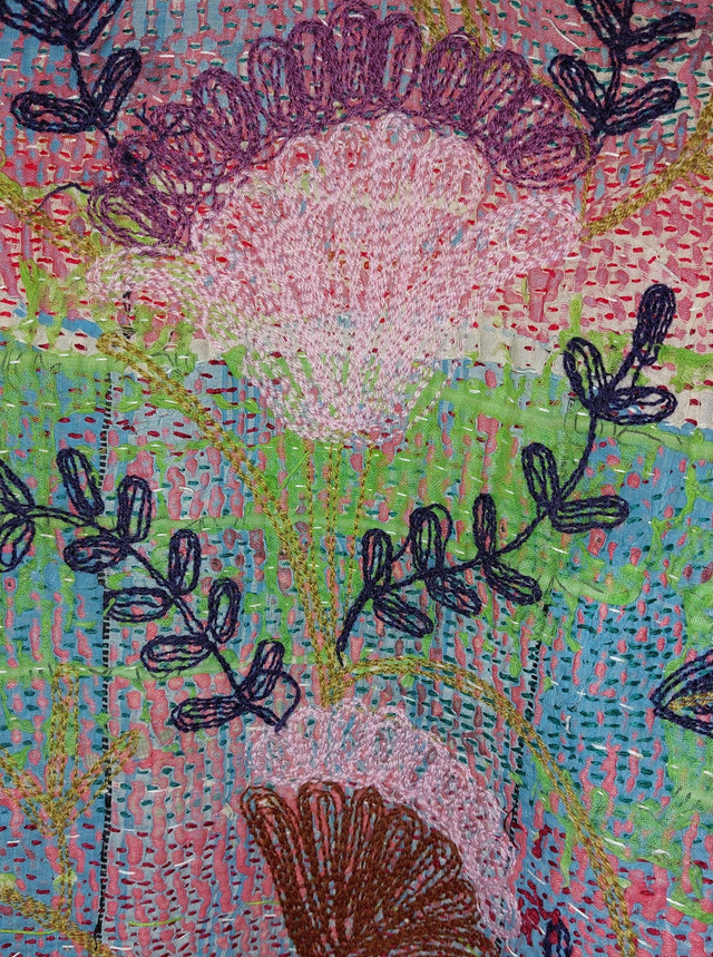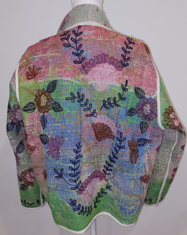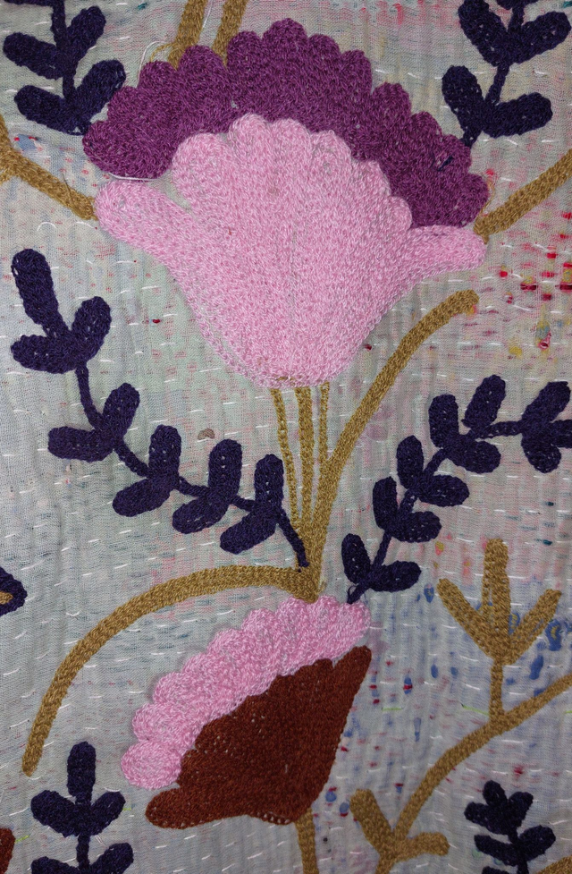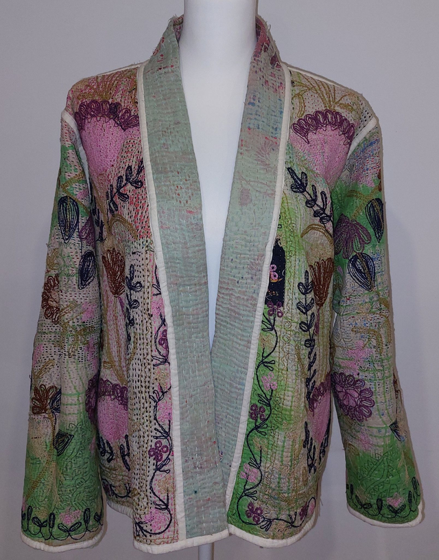 Veste kimono éthique, naturelle et écoresponsable confectionnée avec du kantha recyclé et orné de broderie Suzani en rose, violet, vert, et bleu.