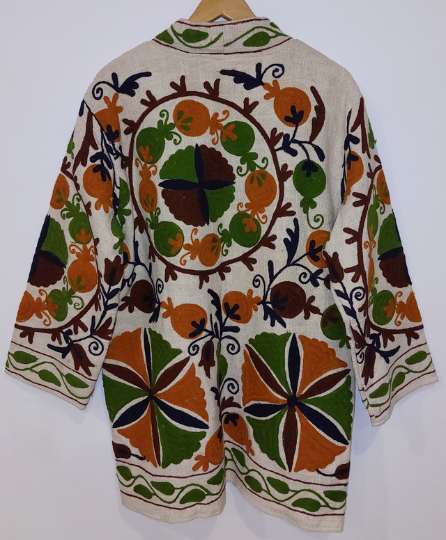 Veste écru, brodée Suzani avec des fleurs en orange, vert, marron et noir ... Les motifs Suzani sont brodés à la main selon un savoir-faire ancestral. Inspiré de l’art textile traditionnel d’Asie centrale, chaque dessin symbolise la nature, la protection et la beauté. Faite à la main en coton TNT noir avec un doublage en coton doux rayé jaune et blanc.