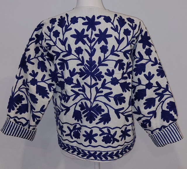 Veste reversible en coton blanc brodé Suzani - Confectionnée à la main - Doublure rayée bleu/blanc