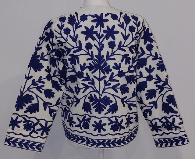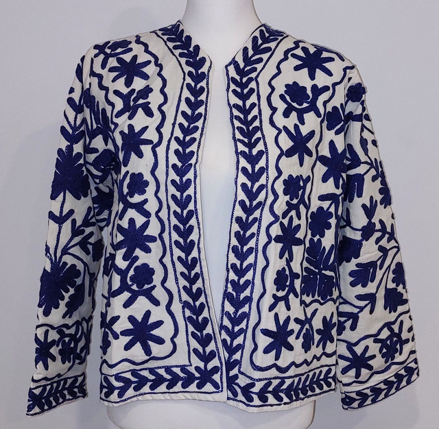 Veste en coton blanc, brodée Suzani... Les motifs Suzani sont brodés à la main selon un savoir-faire ancestral. Inspiré de l’art textile traditionnel d’Asie centrale, chaque dessin symbolise la nature, la protection et la beauté. Faite main.