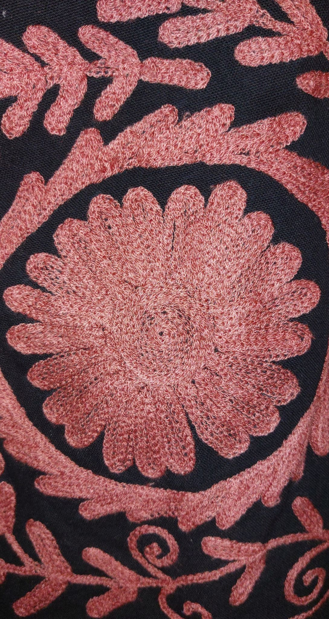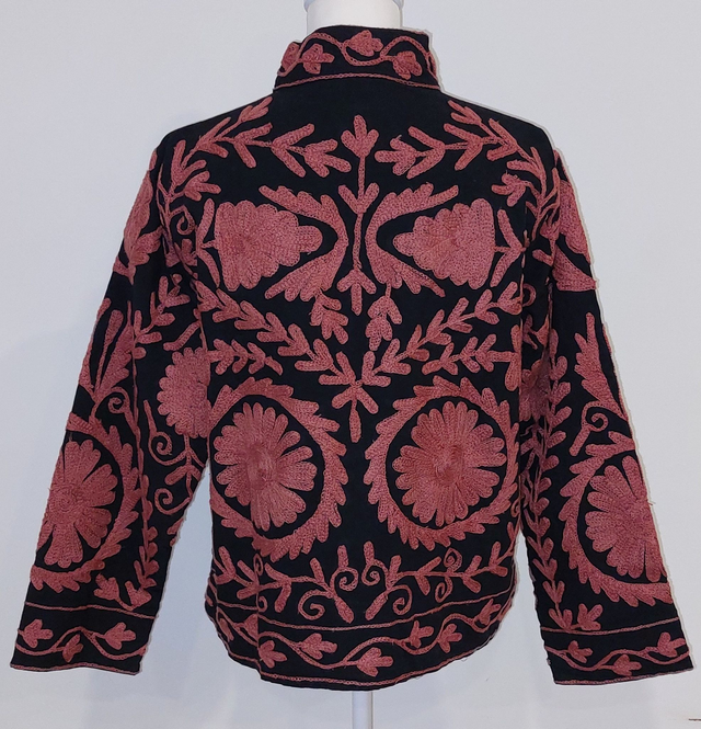 Veste en coton noir, brodée Suzani... Les motifs Suzani sont brodés à la main selon un savoir-faire ancestral. Inspiré de l’art textile traditionnel d’Asie centrale, chaque dessin symbolise la nature, la protection et la beauté. Faite main.