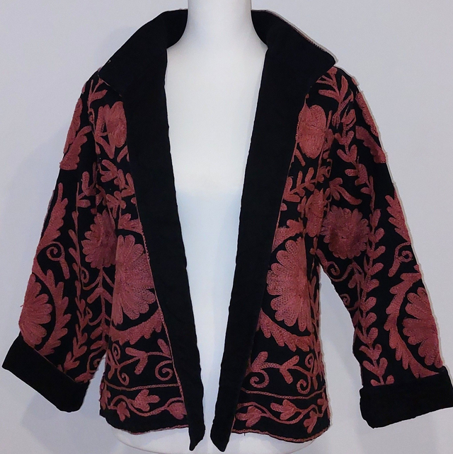 Veste reversible en coton noir brodé Suzani - Confectionnée à la main - Doublure noire