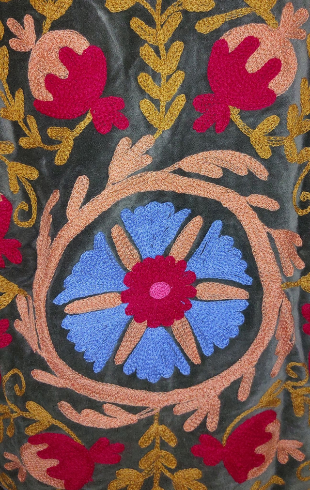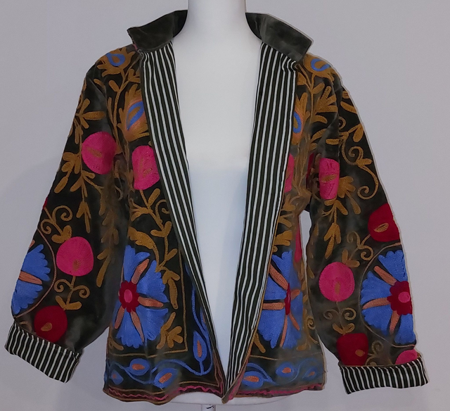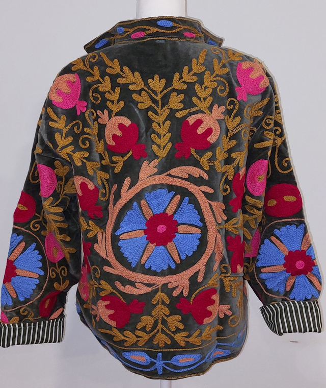 Veste en velours khaki, brodée Suzani avec des fleurs de tons d'automne... Les motifs Suzani sont brodés à la main selon un savoir-faire ancestral. Inspiré de l’art textile traditionnel d’Asie centrale, chaque dessin symbolise la nature, la protection et la beauté. Faite main.