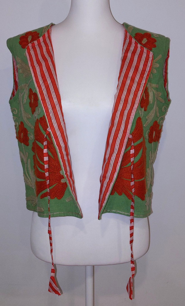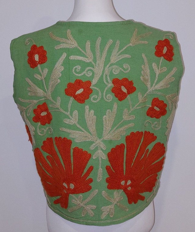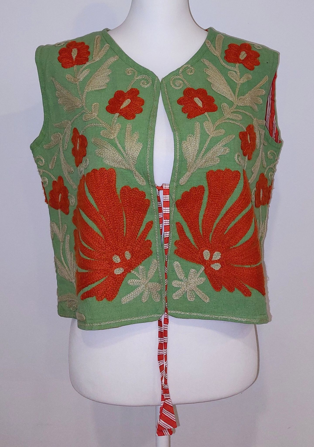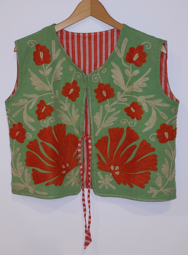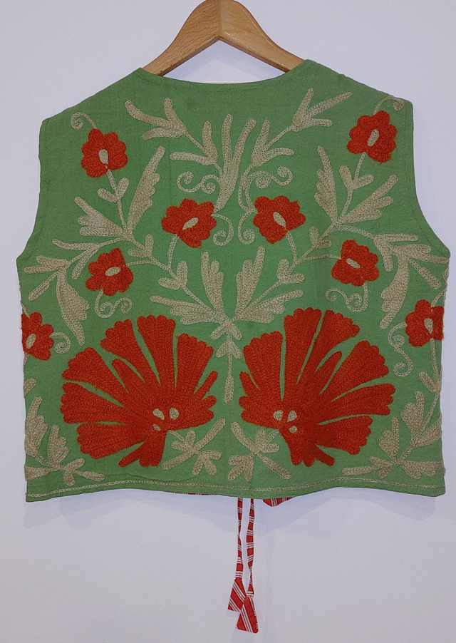 Veste sans manches en coton vert, brodée Suzani... Les motifs Suzani sont brodés à la main selon un savoir-faire ancestral. Inspiré de l’art textile traditionnel d’Asie centrale, chaque dessin symbolise la nature, la protection et la beauté. Faite main.