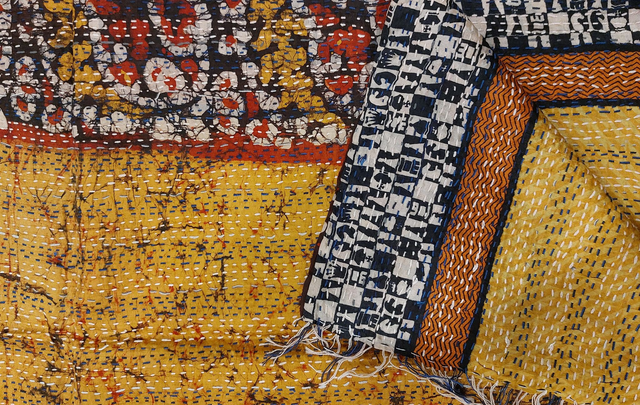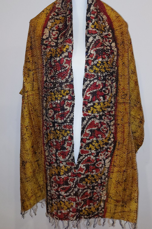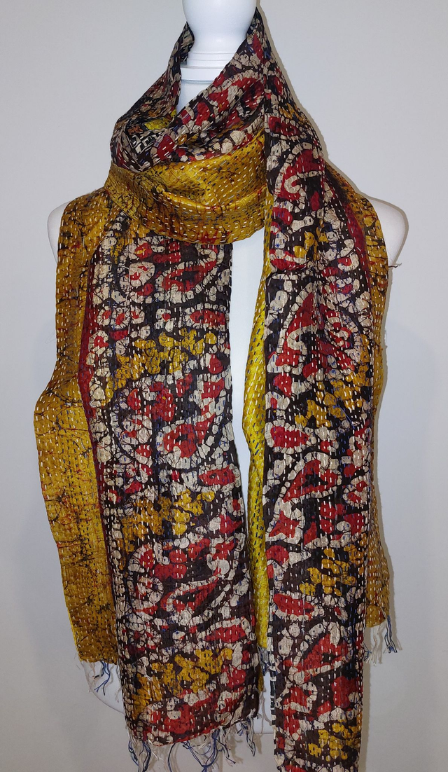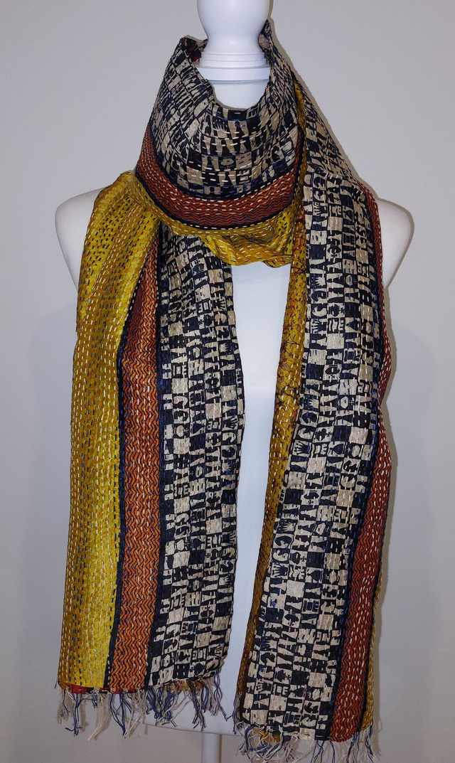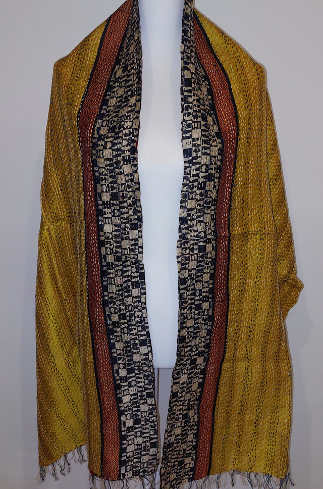 Étole réversible et unique en sari surcyclé brodé kantha. Confectionnée à la main cette étole artisanale est à la fois unique et écoresponsable. Elle est ornée de Kantha, une forme de broderie avec un simple point courant cousu à la main. Cette étole légère et éthique reflète un savoir-faire authentique et une attention particulière aux détails. Idéal pour un look bohème chic en toute saison.