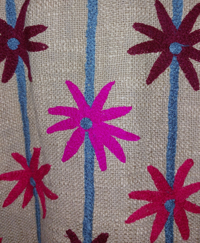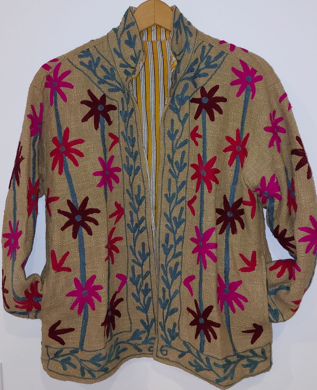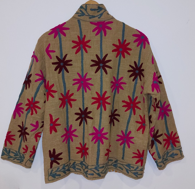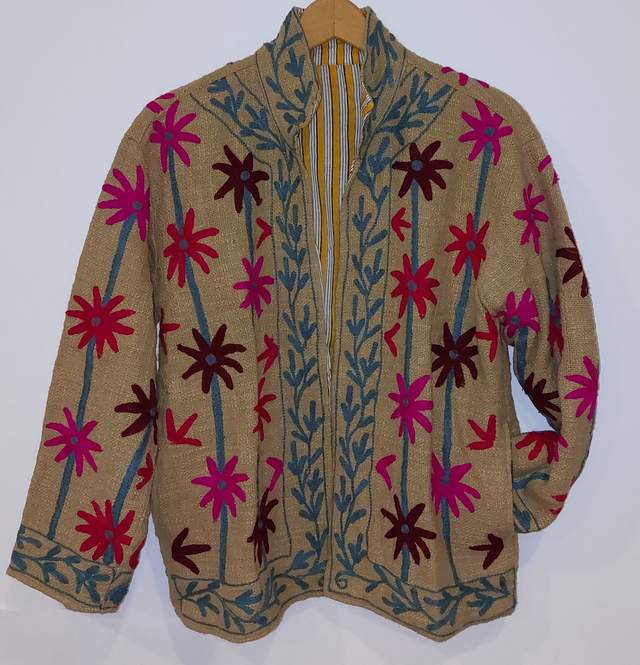 Veste réversible en coton TNT beige - Brodée Suzani, fleurs - Doublure à rayures - Confectionnée à la main