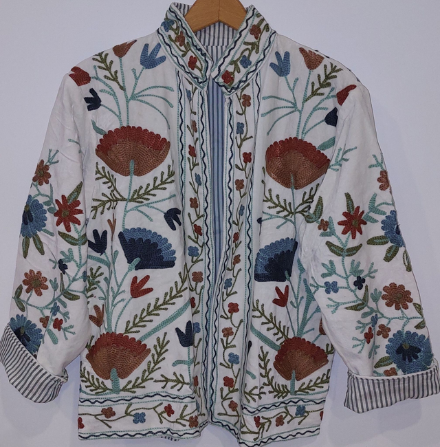 Veste réversible en velours blanc- Brodée Suzani - Doublure à rayures - Confectionnée à la main