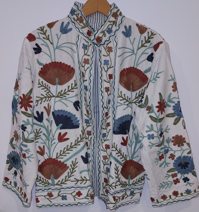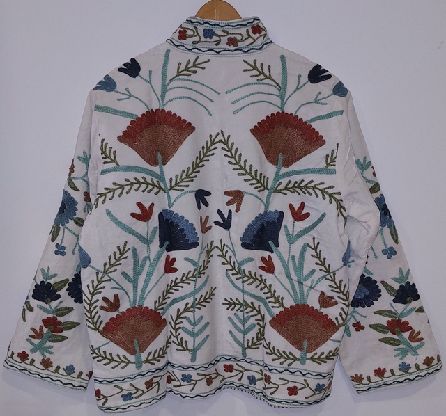 Veste en velours blanc, brodée Suzani avec des fleurs de couleurs pastel. Les motifs Suzani sont brodés à la main selon un savoir-faire ancestral. Inspiré de l’art textile traditionnel d’Asie centrale, chaque dessin symbolise la nature, la protection et la beauté. Faite main.