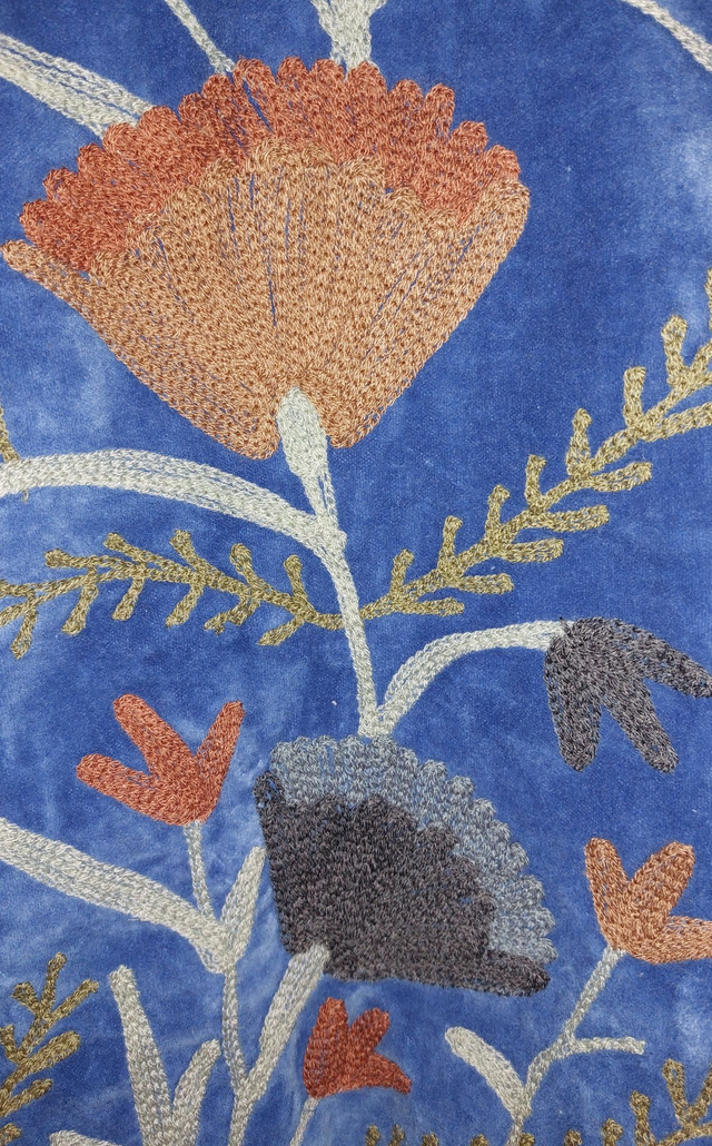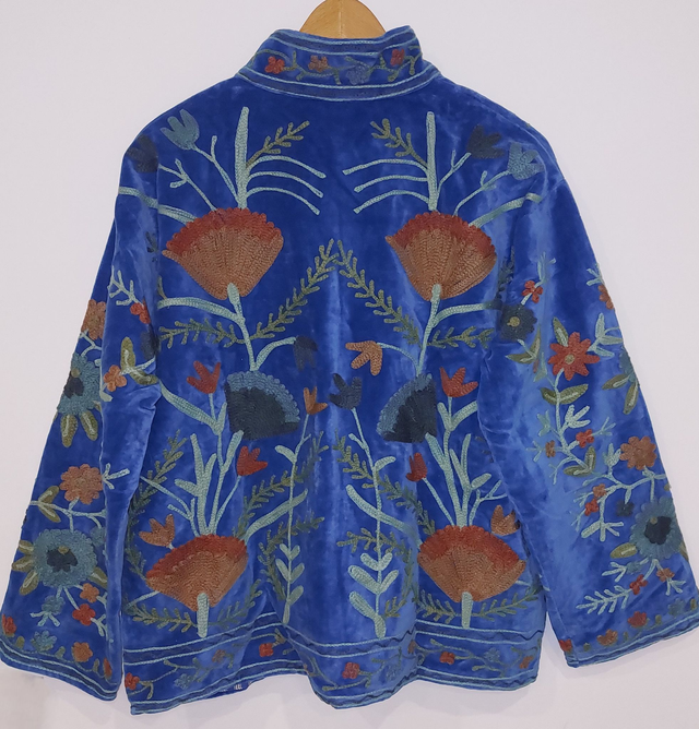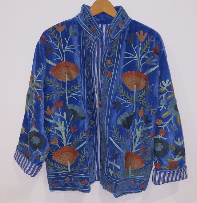 Veste en velours bleu, brodée Suzani avec des fleurs. Les motifs Suzani sont brodés à la main selon un savoir-faire ancestral. Inspiré de l’art textile traditionnel d’Asie centrale, chaque dessin symbolise la nature, la protection et la beauté. Faite main.