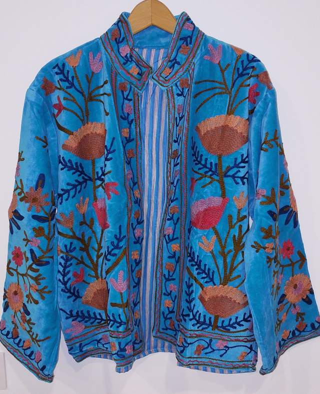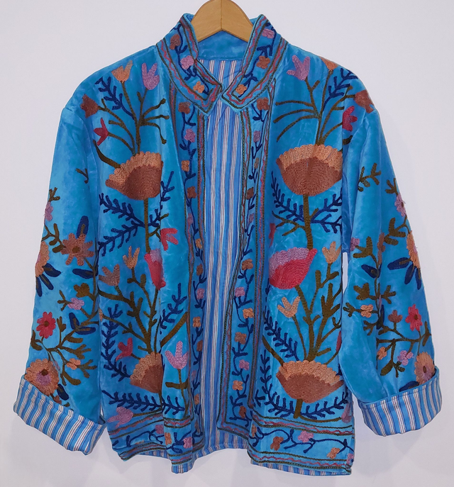 Veste réversible en velours turquoise- Brodée Suzani - Doublure à rayures - Confectionnée à la main