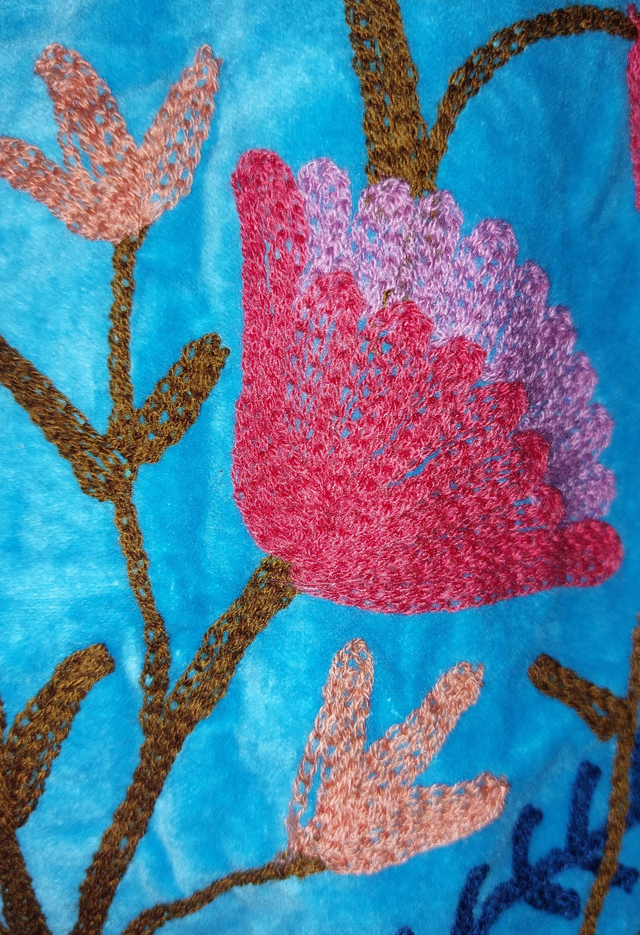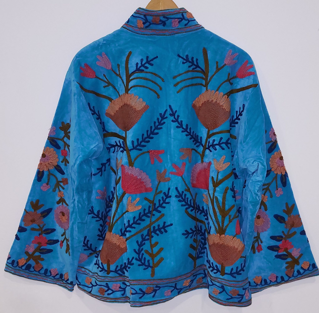 Veste en velours turquoise, brodée Suzani avec des fleurs de couleurs pastel. Les motifs Suzani sont brodés à la main selon un savoir-faire ancestral. Inspiré de l’art textile traditionnel d’Asie centrale, chaque dessin symbolise la nature, la protection et la beauté. Faite main.