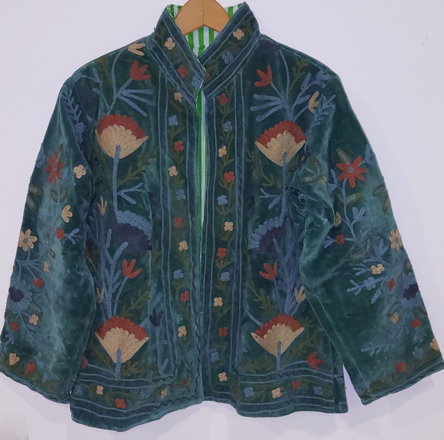 Veste réversible en velours vert - Brodée Suzani - Doublure à rayures - Confectionnée à la main